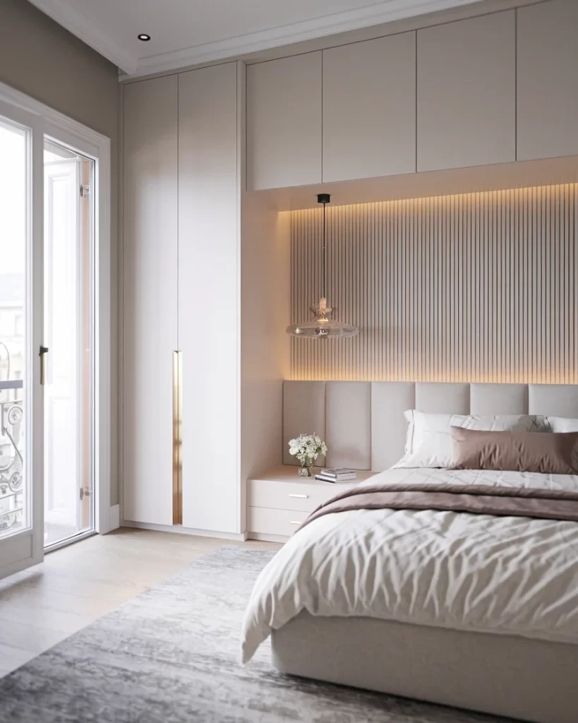 The first image presents a contemporary take on Stockholm style with floor-to-ceiling built-in wardrobes in warm beige tones. The room features a sophisticated headboard with vertical wood slat detailing and integrated LED lighting that creates a warm, ambient glow. The neutral color palette of creams and beiges, combined with clean lines and minimal accessories, exemplifies modern Swedish design principles.
