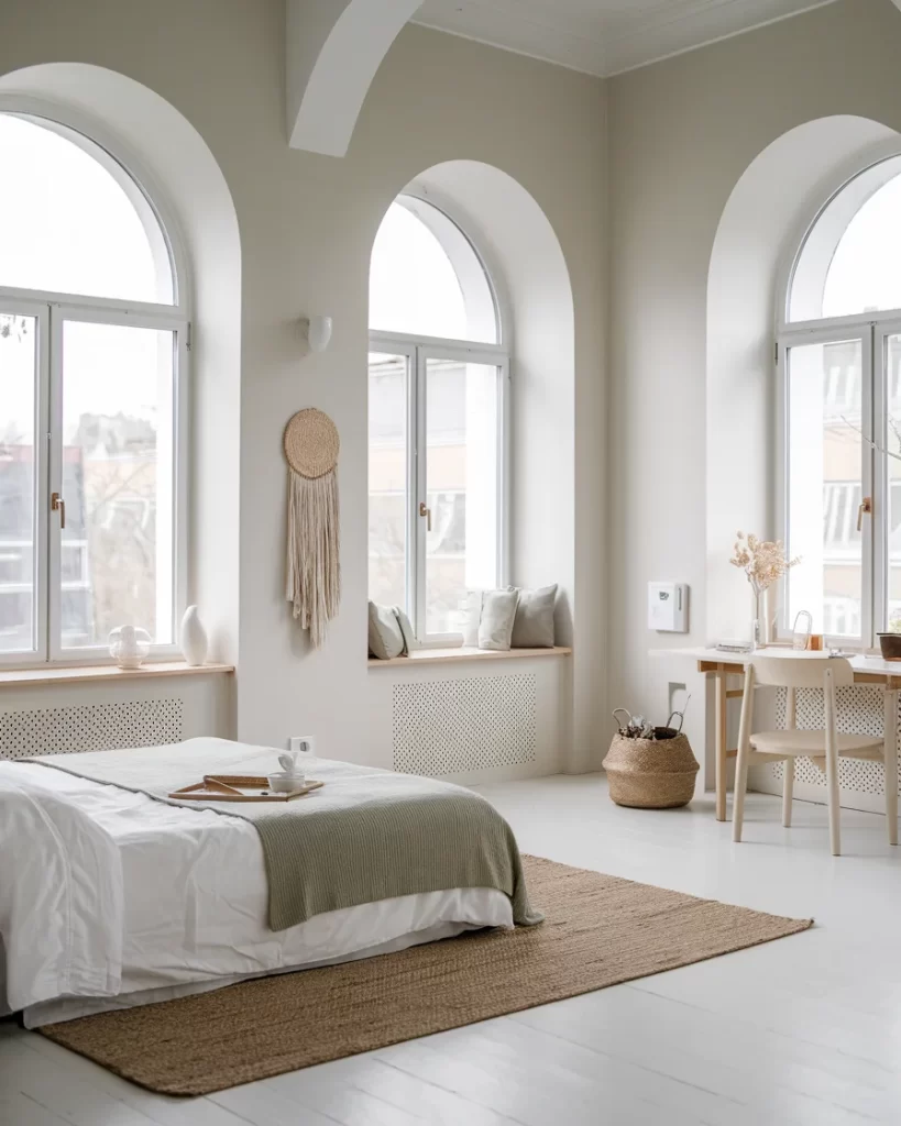 This stunning bedroom showcases dramatic arched windows that flood the space with natural light, embodying the Stockholm principle of maximizing daylight. The room features a built-in window seat with storage, woven wall hangings for texture, and a simple platform bed that doesn’t compete with the architectural features. Natural materials like jute rugs and wicker baskets complement the neutral palette, while the clean white walls and minimal furnishings allow the beautiful stonework and window details to take center stage.
