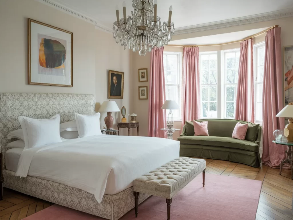 This room blends Stockholm style with classical influences, featuring a crystal chandelier, ornate moldings, and a bay window with soft pink curtains. The floral headboard pattern and traditional furniture pieces show how Scandinavian design can incorporate more decorative elements while maintaining its core principles of comfort and elegance.