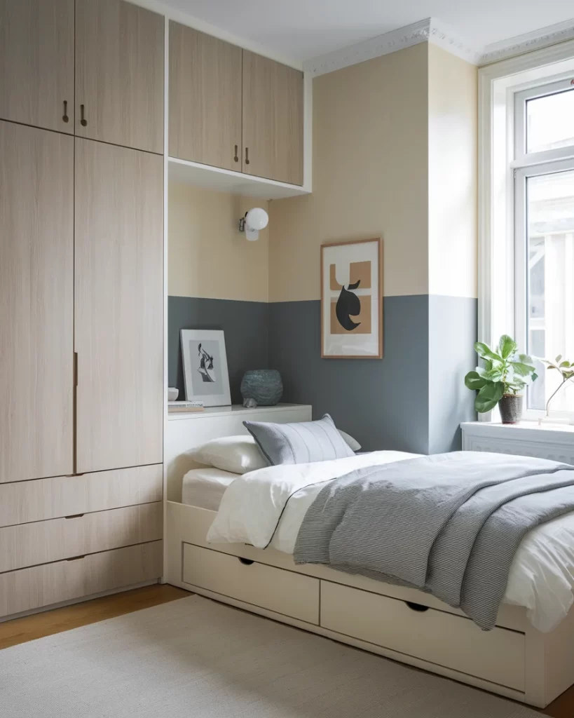 This space-efficient Stockholm bedroom maximizes functionality with floor-to-ceiling built-in wardrobes in light wood veneer and a platform bed with integrated storage drawers. The room features a sophisticated color-blocked accent wall in sage green contrasting with warm beige tones, complemented by minimalist decor including framed artwork and a sculptural white wall sconce. The neutral bedding in gray and white, along with natural wood flooring and subtle greenery on the windowsill, creates the clean, organized aesthetic characteristic of Scandinavian design.