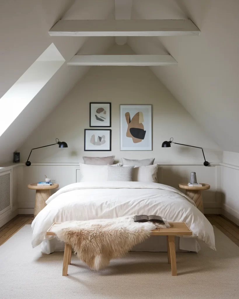 Perfectly utilizing sloped ceiling space, this attic bedroom showcases Stockholm design’s adaptability to architectural constraints. The built-in storage along the low walls maximizes space efficiency, while modern abstract artwork and sleek black swing-arm sconces add contemporary touches. A natural wood bench with sheepskin throw provides seating and texture, and the neutral carpet and white walls create a cocoon-like retreat that feels both cozy and sophisticated.