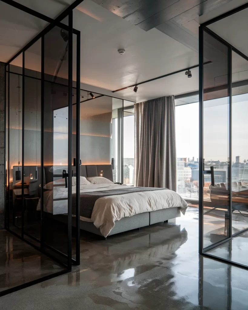 Featuring dramatic floor-to-ceiling glass partitions with black metal frames, this bedroom demonstrates how Stockholm style can incorporate industrial elements. The polished concrete floors and exposed ceiling elements create an urban loft aesthetic while maintaining the clean, uncluttered approach typical of Scandinavian design.