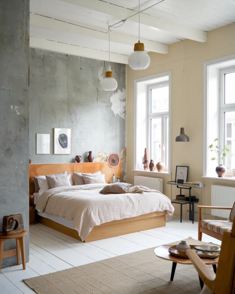 This bedroom showcases Stockholm style with industrial influences, featuring exposed concrete walls, white painted wooden ceiling beams, and a warm oak platform bed. The space includes distinctive white paper lantern pendants with natural cork accents, creating ambient lighting that softens the raw concrete textures. Natural elements like ceramic pottery, woven textiles, and a jute area rug bring warmth to the space, while the white painted wooden floors and large windows maintain the bright, airy feel essential to Scandinavian interiors.