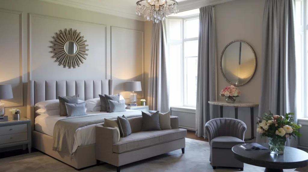 A sophisticated interpretation featuring a channel-tufted headboard in soft gray and complementary seating area. The room demonstrates Stockholm style’s ability to feel luxurious through quality materials and thoughtful proportions rather than excessive ornamentation. Metallic accents and carefully curated accessories add refinement.