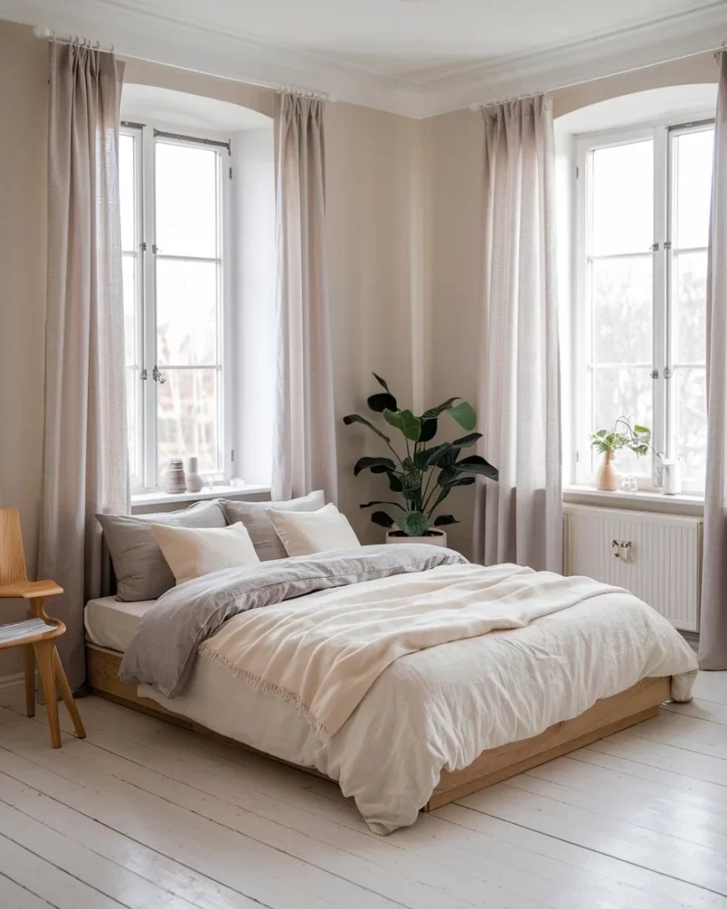 This corner bedroom with dual windows demonstrates Stockholm style’s mastery of light and space. The simple wooden platform bed is positioned to take advantage of natural light from both directions, while soft linen curtains in natural tones provide privacy without blocking illumination. A large potted plant adds life to the space, and the monochromatic palette of creams and soft beiges creates a serene atmosphere that embodies the peaceful, uncluttered essence of Scandinavian design.