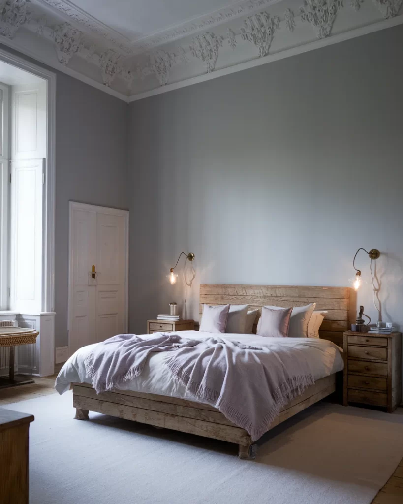 Combining Stockholm minimalism with historic charm, this bedroom features ornate ceiling moldings, weathered reclaimed wood furniture, and sophisticated gray walls. The rustic wooden bed frame and matching nightstands contrast beautifully with the refined architectural details, while brass swing-arm wall sconces provide functional task lighting. The neutral color palette of grays and natural wood tones, paired with crisp white linens, demonstrates how Stockholm style can honor traditional craftsmanship while maintaining contemporary simplicity.