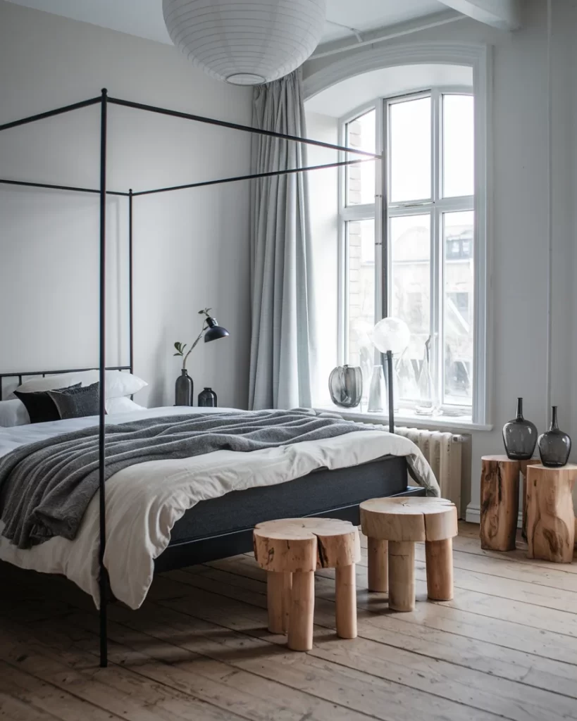 This Stockholm style bedroom showcases Nordic minimalism through its harmonious blend of natural and industrial elements. The space features a simple black metal bed frame with crisp white bedding and gray accents, illuminated by a large white paper lantern pendant and natural light from a beautiful arched window with gray curtains. The room emphasizes Scandinavian design principles with round wooden tree trunk stools at the foot of the bed, natural wood plank flooring, and white painted walls with exposed ceiling beams. Dark glass vases on wooden logs add decorative touches while maintaining the clean aesthetic. The monochromatic color palette of whites, grays, and natural wood tones, combined with strategic black metal accents, creates the serene, uncluttered atmosphere characteristic of authentic Stockholm style design.