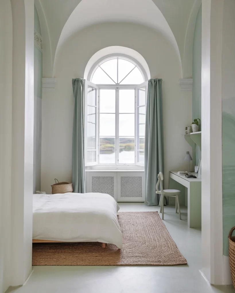 Designed within an arched alcove, this intimate Stockholm bedroom demonstrates how to create tranquility in small spaces. The soft sage green built-in desk area contrasts with crisp white walls and natural jute texturing, while the simple platform bed maintains the uncluttered aesthetic. The arched window with geometric glazing provides natural light, and the neutral color scheme of whites and soft greens creates a calming retreat that exemplifies Scandinavian design’s focus on peace and simplicity.
