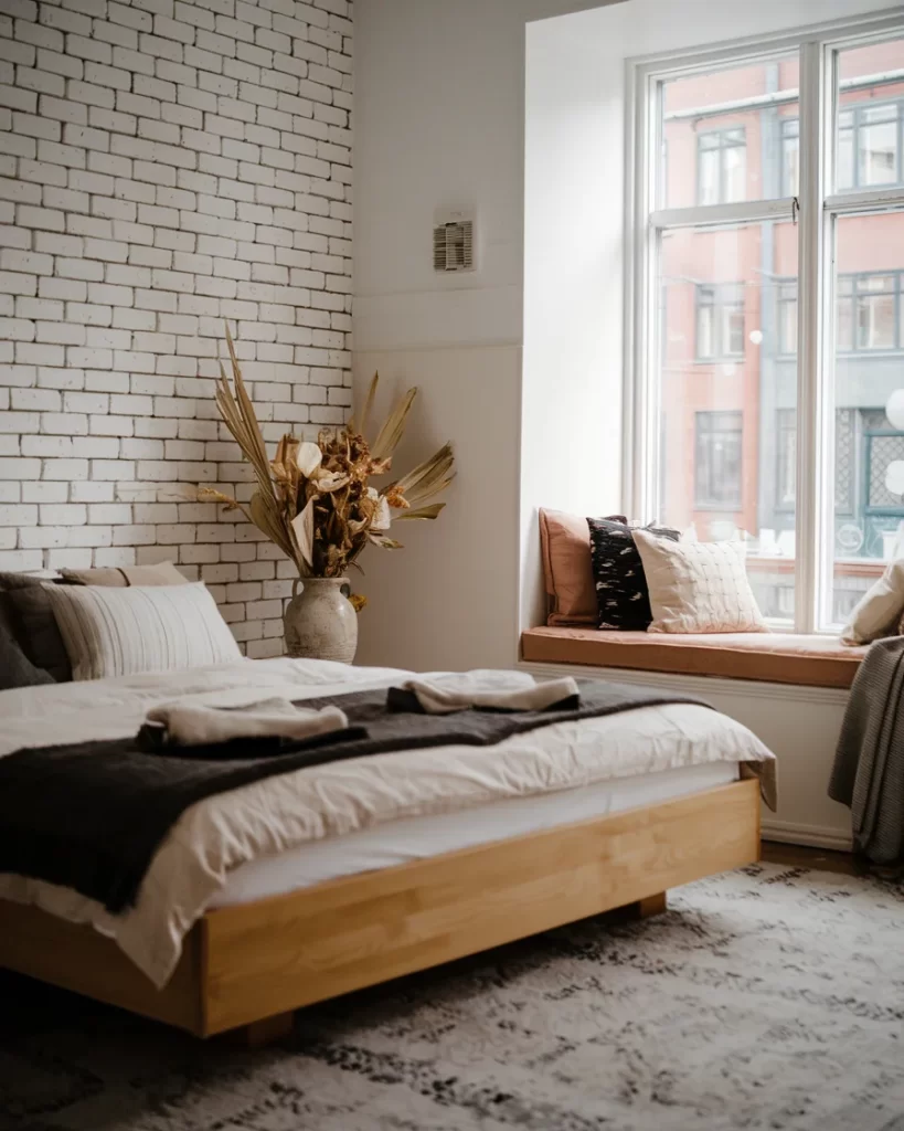 This bedroom combines Stockholm minimalism with urban texture through a striking white painted brick accent wall. The natural wood platform bed anchors the space, while a cozy window seat with mixed pillows creates a reading nook overlooking the street. Golden dried botanicals in a ceramic vase add seasonal warmth, and the vintage-style area rug introduces subtle pattern without overwhelming the clean aesthetic. The neutral palette and natural materials maintain the Scandinavian emphasis on comfort and natural beauty.