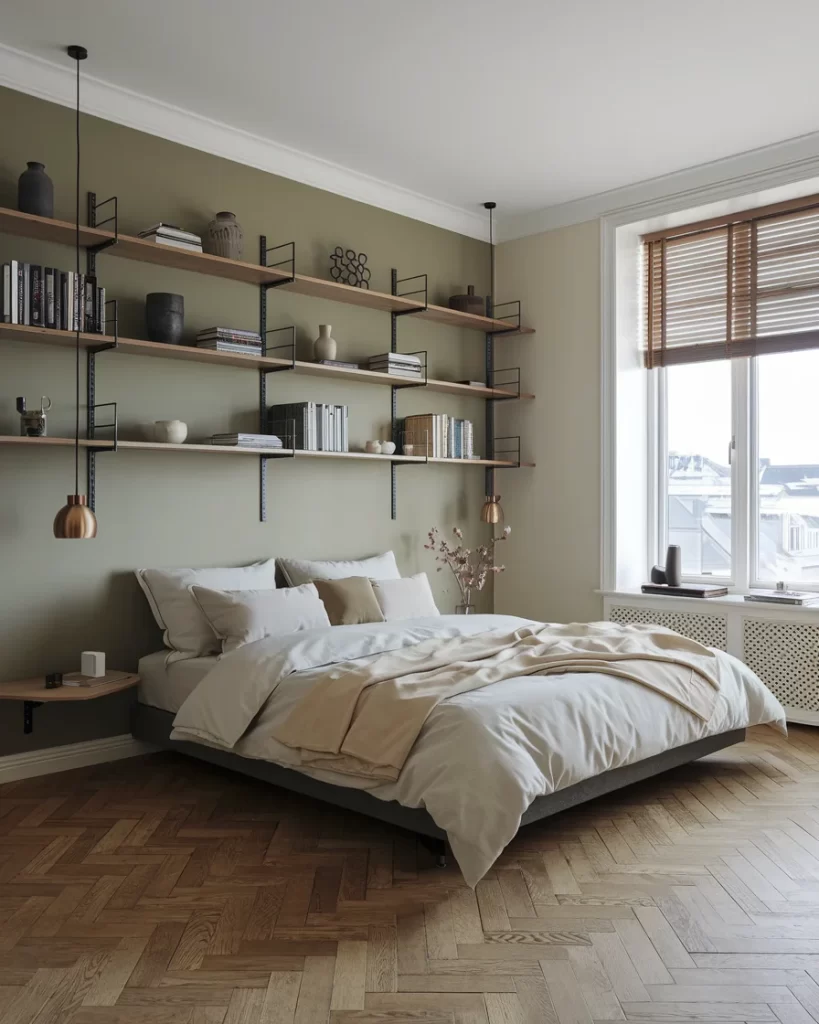 Featuring an impressive wall-mounted shelving system with black metal brackets and natural wood shelves, this bedroom demonstrates Stockholm style’s embrace of functional design. The olive green accent wall provides a sophisticated backdrop for the curated display of books, ceramics, and minimal decor. The low platform bed, natural wood flooring in a herringbone pattern, and copper pendant lights create warmth while maintaining the clean lines characteristic of Scandinavian interiors.