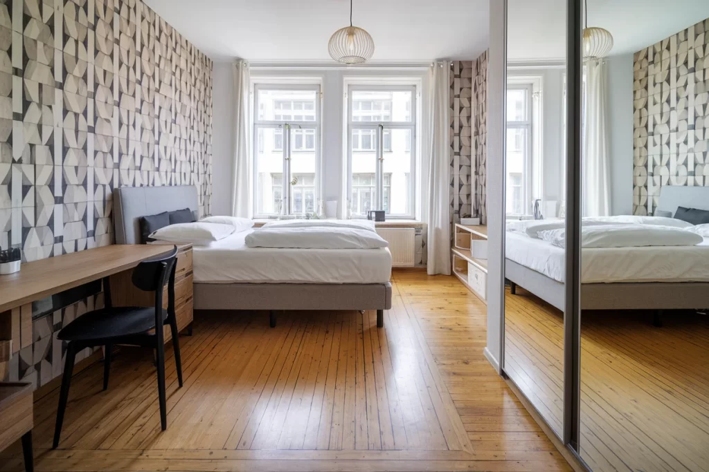 This bedroom incorporates bold geometric wallpaper while maintaining Stockholm design principles through its simple furniture forms and natural wood floors. The mirrored wardrobe doors and minimal desk setup demonstrate how pattern can be used strategically without overwhelming the space’s serene quality.