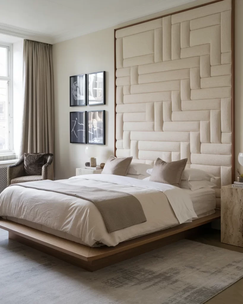 This design showcases a dramatic upholstered headboard wall with geometric quilted patterns, demonstrating how texture can create visual interest in Stockholm style interiors. The floating nightstands and warm wood tones against neutral backgrounds exemplify the Scandinavian approach to material mixing.