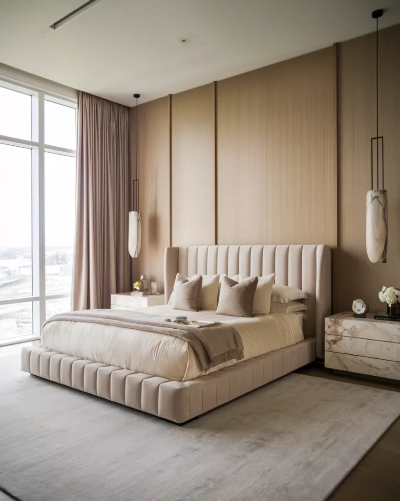 Featuring a channel-tufted platform bed in cream tones against rich wood paneling, this room shows Stockholm style’s embrace of natural materials. The floor-to-ceiling windows, pendant lighting, and marble-topped surfaces create a sophisticated yet cozy atmosphere characteristic of contemporary Scandinavian design.