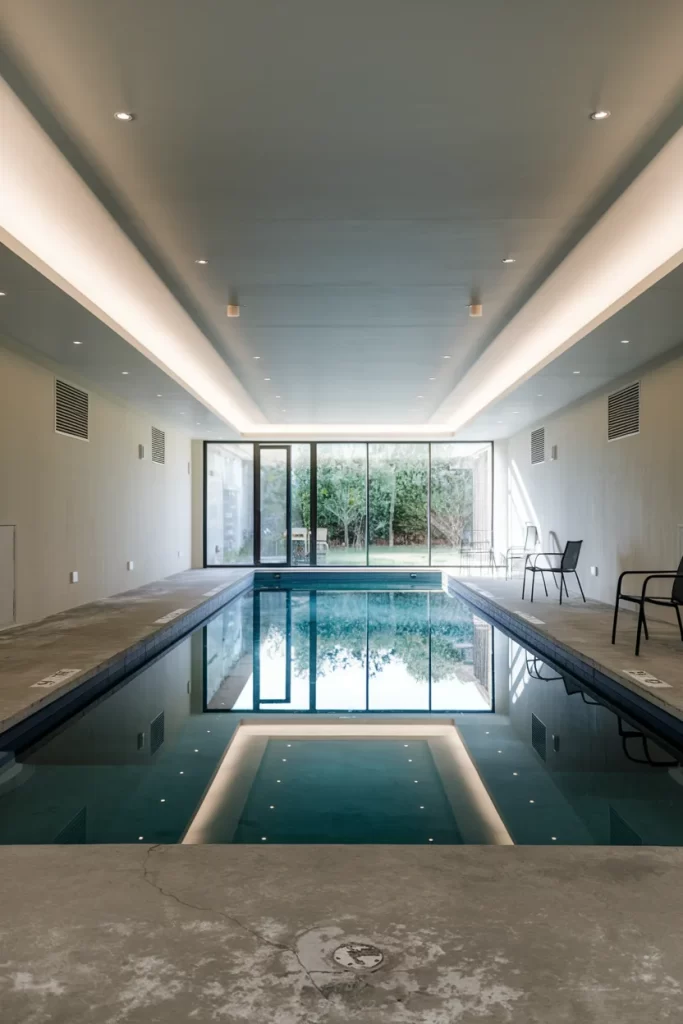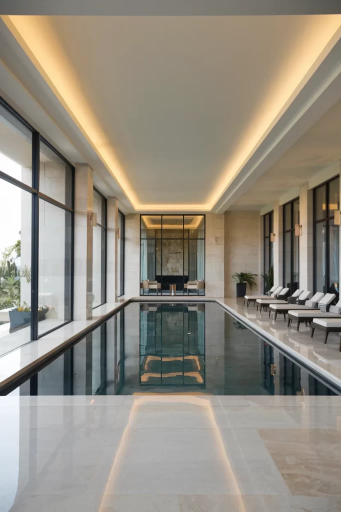 This expansive indoor pool area feels like a luxury resort with its long rectangular pool and floor-to-ceiling windows offering garden views. The design features a sophisticated lighting scheme with LED strips creating geometric patterns on the ceiling. Multiple lounge chairs line one side of the pool, while the neutral stone and tile finishes maintain an elegant, hotel-like atmosphere. The connection to outdoor views prevents the space from feeling enclosed.