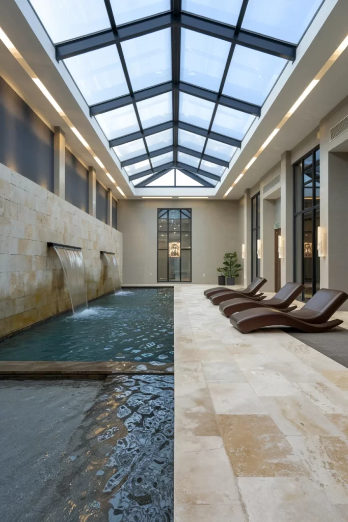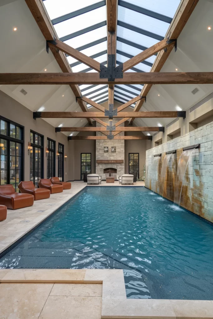 This indoor pool perfectly balances rustic charm with contemporary design. Exposed wooden beams and a glass ceiling create architectural interest while allowing abundant natural light. The space includes a cozy seating area with leather furniture and a traditional stone fireplace, making it ideal for year-round use. Water features along the stone wall add movement and sound to the tranquil environment.