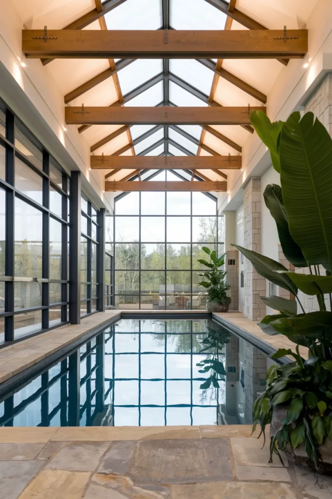 A stunning glass conservatory houses this elegant indoor pool, featuring a dramatic vaulted ceiling with exposed wooden beams. The space maximizes natural light through floor-to-ceiling windows and skylights, creating an outdoor feel while remaining protected from the elements. Large tropical plants enhance the greenhouse aesthetic, making this pool area feel like a private botanical garden.
