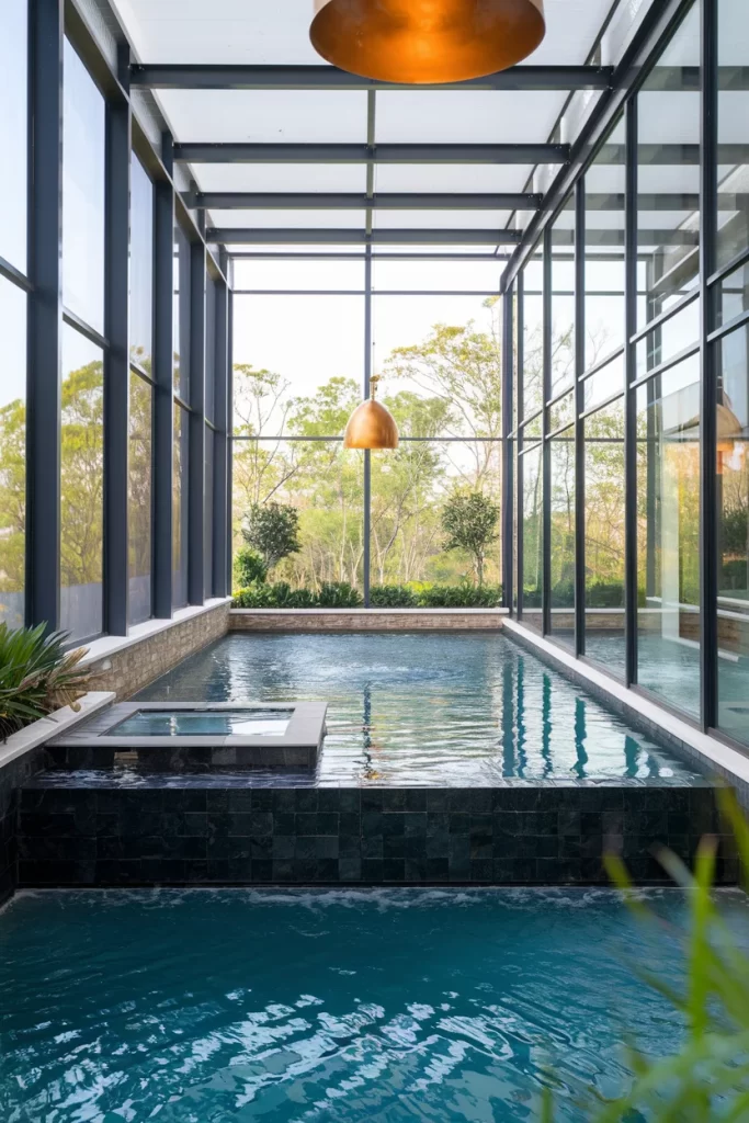 An architectural marvel featuring floor-to-ceiling glass walls and a striking infinity edge design that seems to merge with the outdoor landscape. The sleek black tile work and minimalist pendant lighting create a sophisticated atmosphere, while the glass structure provides unobstructed views of the surrounding greenery. This design blurs the line between indoor and outdoor living.