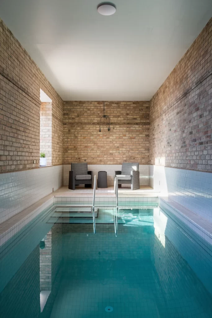 This indoor pool embraces an industrial aesthetic with exposed brick walls that add texture and warmth to the space. The rectangular pool design is clean and modern, contrasting beautifully with the traditional brick elements. Simple lounge chairs provide a place to relax, while the high ceilings and minimal decorative elements create an open, airy feeling. The combination of old and new materials makes this design both timeless and contemporary.