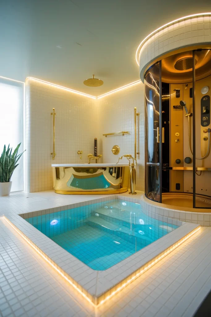 This opulent indoor pool design features gold accents throughout, including a stunning metallic bathtub and luxury shower enclosure. The square pool with turquoise tiles is surrounded by LED strip lighting that creates a warm glow. White mosaic walls and curved design elements add to the high-end spa aesthetic, making this space feel like a private wellness retreat.