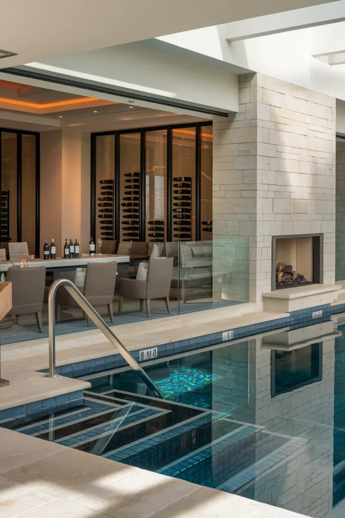 This sophisticated indoor pool combines elegance with entertainment, featuring a striking glass-enclosed wine cellar as the backdrop. The space showcases beautiful stone walls, modern furnishings in neutral tones, and a sleek geometric pool design with mosaic tile details. The integration of a fireplace and bar area creates the perfect atmosphere for upscale entertaining, while warm lighting enhances the luxurious ambiance.
