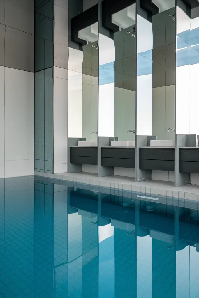 This striking indoor pool design features a bold architectural approach with floating concrete vanities positioned over the water. The space utilizes a monochromatic palette of grays and whites, with floor-to-ceiling mirrors creating dramatic reflections. The geometric design elements and clean lines exemplify modern minimalism, while the integration of functional elements like the vanities makes efficient use of space in this ultra-contemporary setting.