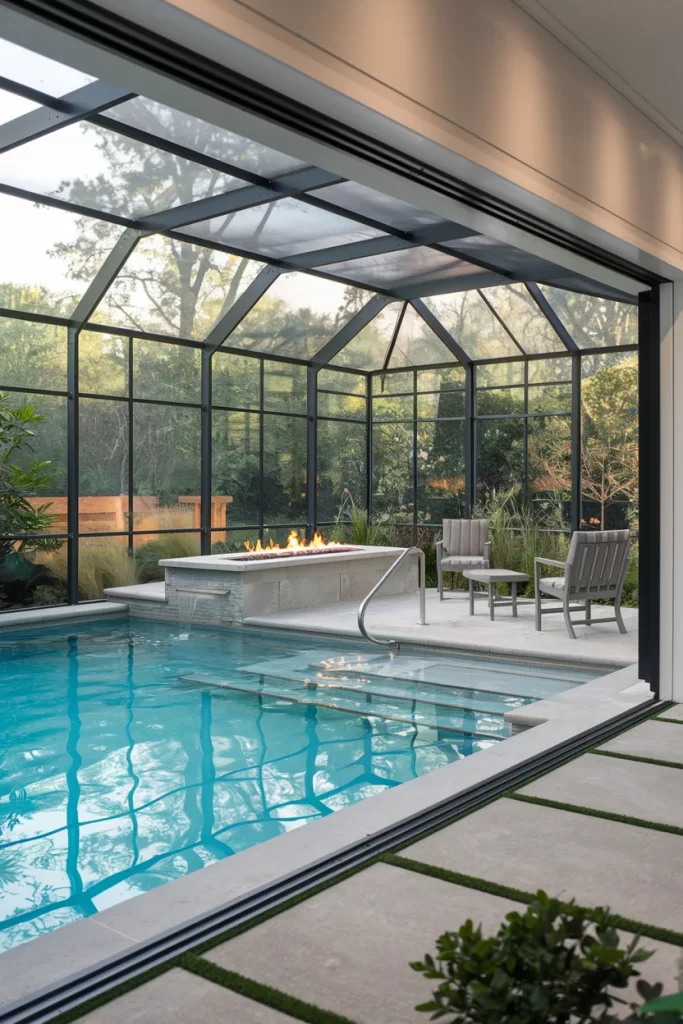 A contemporary glass pavilion houses this stylish indoor pool, offering protection from the elements while maintaining a connection to the outdoors. The geometric glass ceiling and walls create a greenhouse-like environment, while a modern fire feature provides warmth and ambiance. The seamless indoor-outdoor flow makes this space perfect for entertaining in any season.