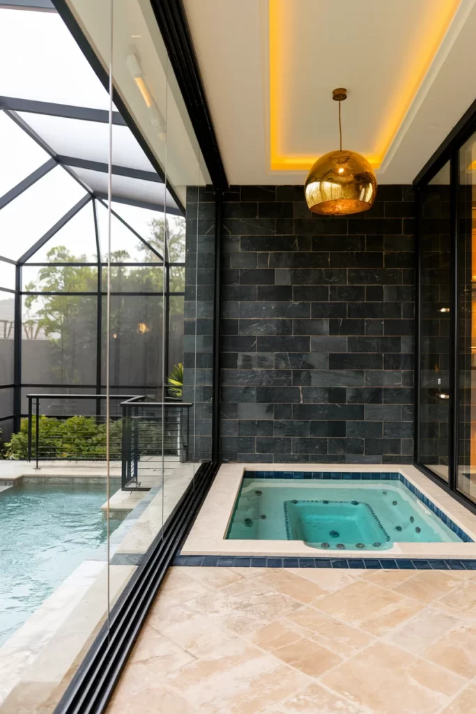 This contemporary pool design features a separate hot tub area with dramatic pendant lighting and sleek black stone accent walls. The glass conservatory structure provides year-round use while the warm LED strip lighting creates ambiance for evening relaxation. The combination of natural stone and modern fixtures creates a luxurious spa experience.