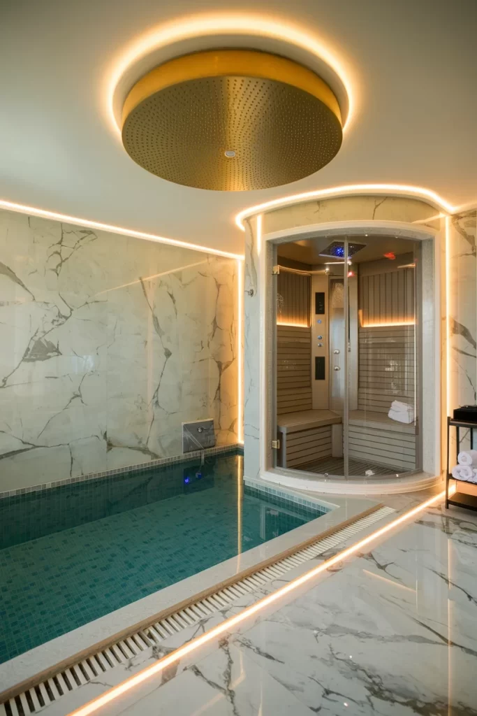 The ultimate in luxury wellness design, this space combines an indoor pool with an integrated sauna featuring curved glass doors. Dramatic LED ceiling lighting and marble wall treatments create a sophisticated atmosphere, while the geometric pool design adds visual interest. The warm wood sauna contrasts beautifully with the cool marble and tile surfaces, offering a complete spa experience at home.