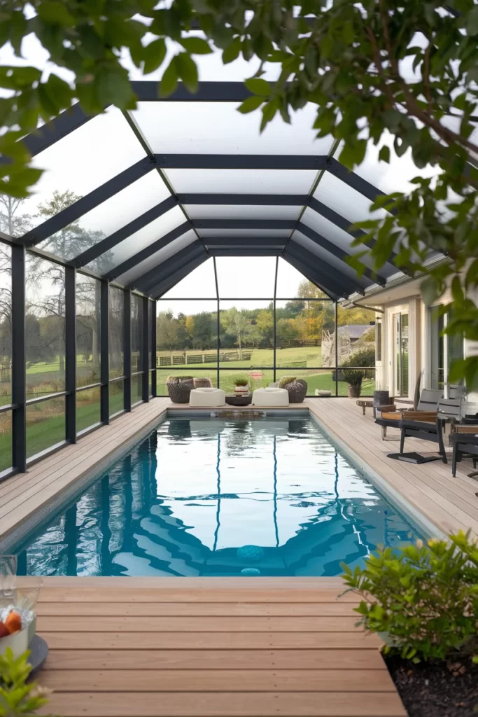 A perfect blend of rustic and modern elements, this enclosed pool features beautiful wooden decking alongside sleek glass walls. The conservatory design opens to pastoral views of fields and trees, while comfortable outdoor furniture creates multiple relaxation zones. The wooden accents warm up the modern glass structure, creating an inviting family-friendly space.