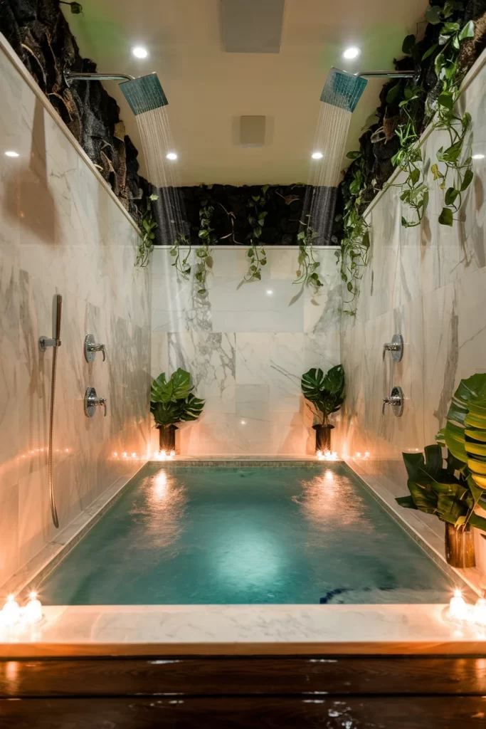 This luxurious indoor pool creates a spa-like retreat with dual rainfall showers positioned directly above the water. The design features marble-patterned walls that create an elegant backdrop, while lush tropical plants cascade from the ceiling and surround the pool area. Warm ambient lighting and floating candles add to the serene atmosphere. The turquoise water reflects the overhead lighting beautifully, and the integration of natural elements like monstera leaves makes this space feel like a private oasis indoors.