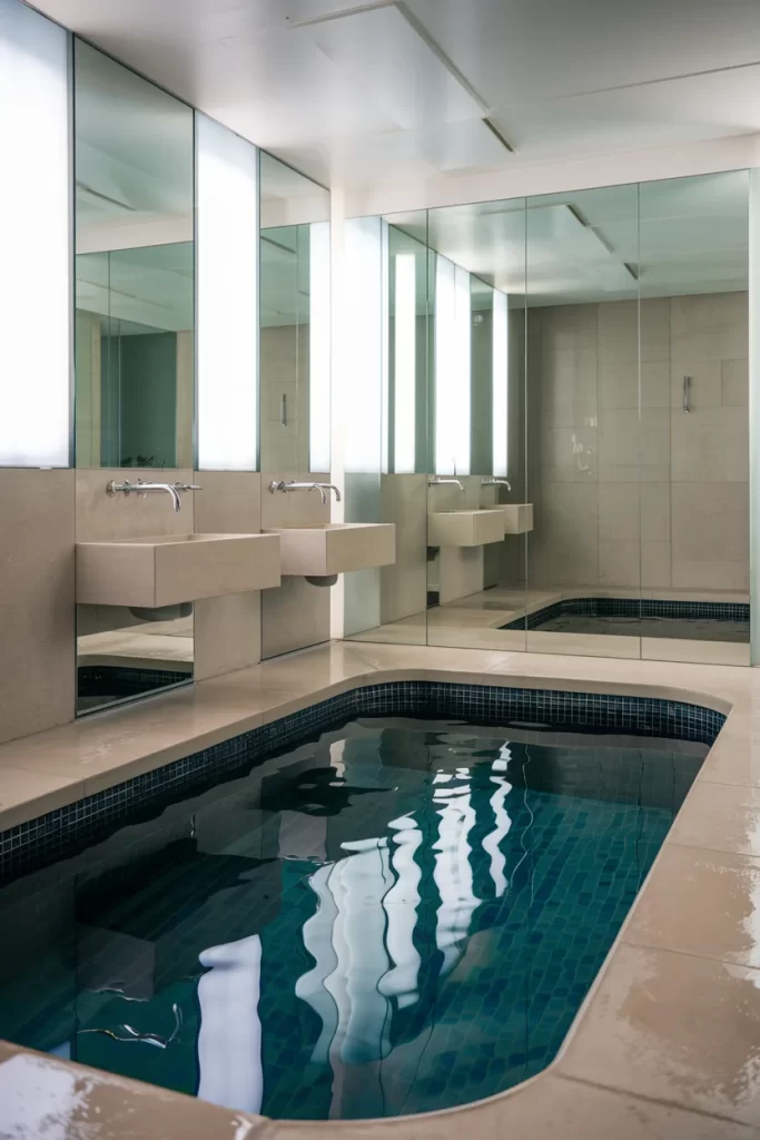 Minimalist Indoor Pool with Floating Vanities