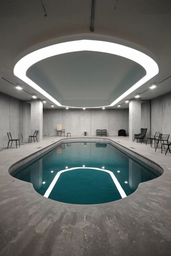 A dramatically modern underground pool space featuring raw concrete walls and a striking geometric light fixture that mirrors the pool’s angular shape. This minimalist design creates an almost cave-like atmosphere, with the sculptural lighting serving as both illumination and art. The monochromatic palette and stark geometry appeal to those who appreciate bold, contemporary architecture.