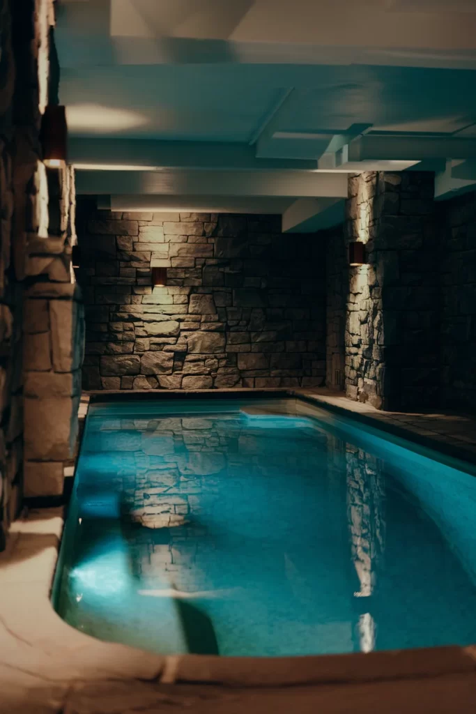 This atmospheric basement pool creates a dramatic underground oasis with its natural stone walls and moody lighting. The rough-hewn stone columns and textured masonry walls give the space a cave-like, spa-inspired ambiance. Warm lighting reflects off the turquoise water, while the rustic stone materials create an intimate, resort-style environment perfect for relaxation and entertaining in a lower level space.