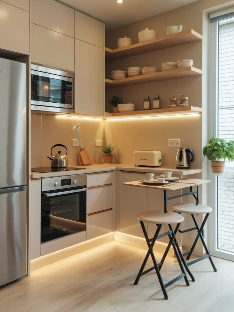 Install LED strips underneath each shelf to create a gentle glow that highlights your displayed items and provides task lighting for food preparation. Choose wood species that complement your cabinet tones, such as oak for lighter kitchens or walnut for richer schemes. The lighting transforms these shelves from simple storage into stunning design features that work day and night. Position shelves at varying heights to create visual rhythm, and style them with a mix of everyday items and decorative pieces. This technique works especially well in galley kitchens or areas lacking upper cabinets, providing storage without blocking sight lines or natural light flow.