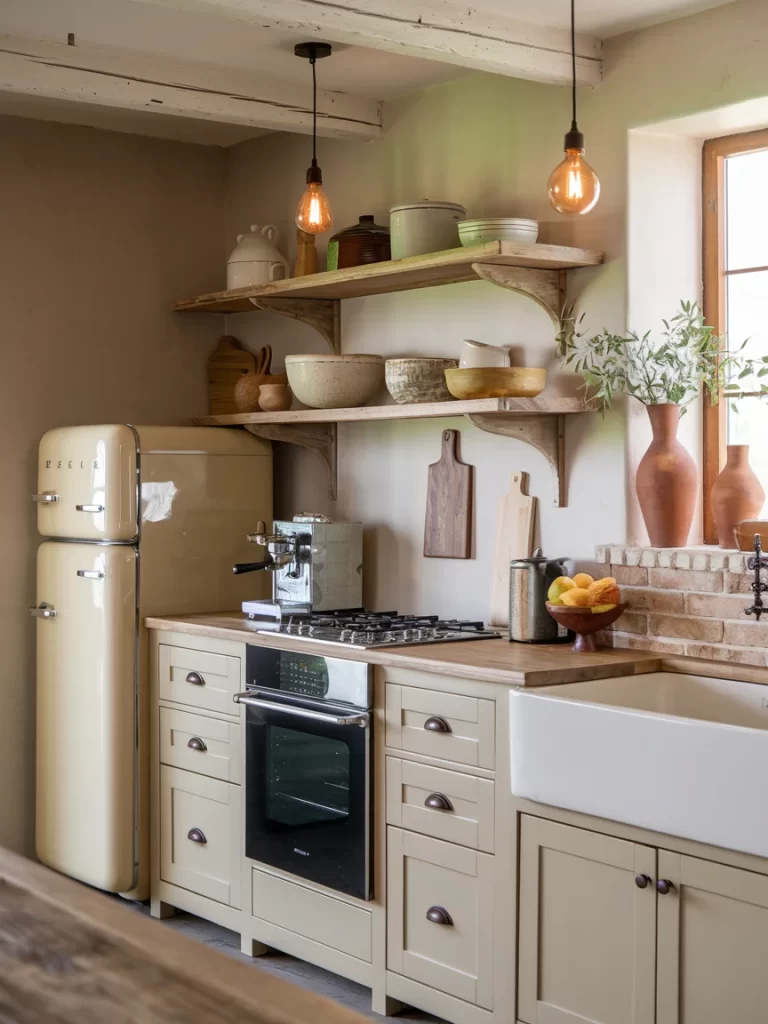 Choose appliances in warm cream or butter tones rather than stark white to maintain the cozy neutral aesthetic. Vintage-style refrigerators, ranges, and dishwashers in these colors create cohesive warmth while offering modern functionality. Pair these appliances with simple cabinetry in complementary neutral tones to let the appliances shine as statement pieces. This approach works beautifully in farmhouse, cottage, or eclectic kitchen styles where character matters as much as function. Add brass or copper hardware throughout the space to enhance the vintage appeal, and consider open shelving to display period-appropriate accessories and dishware that complement your appliance choices.