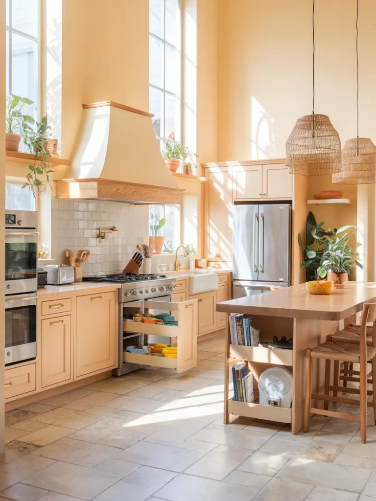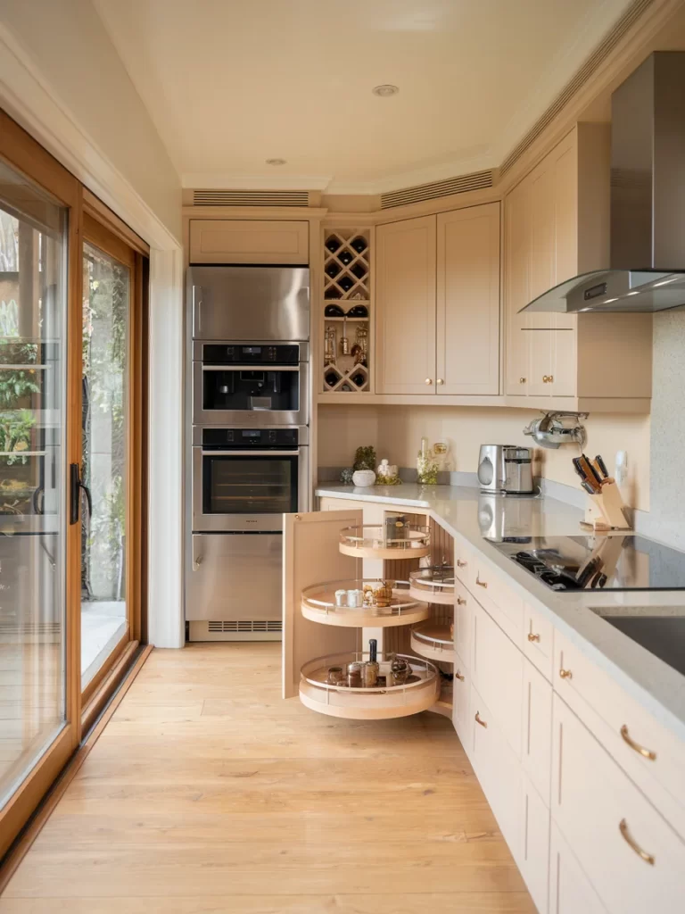 Maximize kitchen efficiency with pull-out storage solutions finished in warm wood tones that coordinate with your neutral cabinet palette, as shown in your well-organized kitchen examples. These functional elements add convenience while maintaining visual warmth.