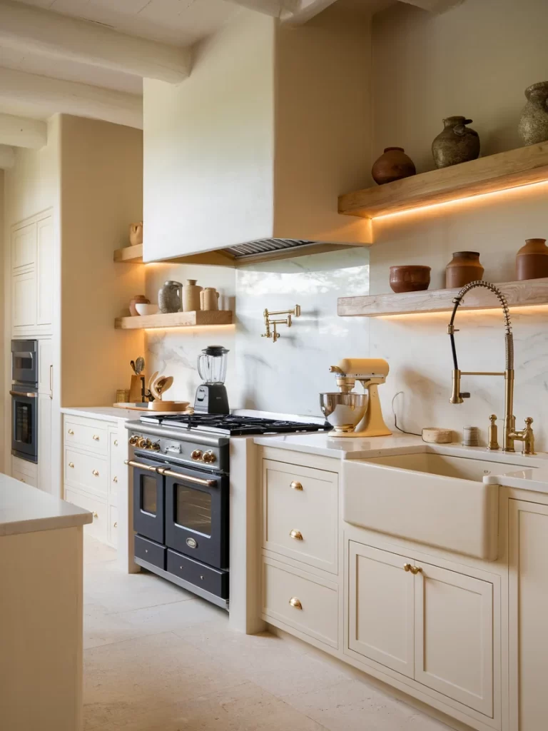Build range hoods in materials like warm-toned plaster, painted wood, or stone that complement your overall neutral palette. The hood becomes sculptural architecture that draws the eye upward and creates vertical interest in your kitchen design. Consider curves or tapered shapes that feel organic rather than boxy commercial styles. Integrate the hood seamlessly with surrounding cabinetry through matching materials or coordinating colors. This approach works beautifully with both traditional and modern kitchen styles, providing necessary ventilation while serving as the room’s crowning design element. Add interior lighting to illuminate your cooking surface and create ambient glow during evening hours.
