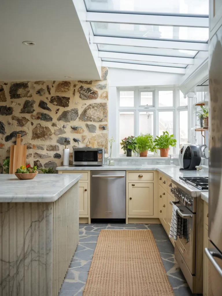 Incorporate natural stone accent walls behind your cooking area to add texture and earthiness to cream-colored kitchen schemes. The stone provides organic warmth and creates a stunning backdrop for stainless steel appliances and neutral cabinetry, as shown in your rustic kitchen examples.