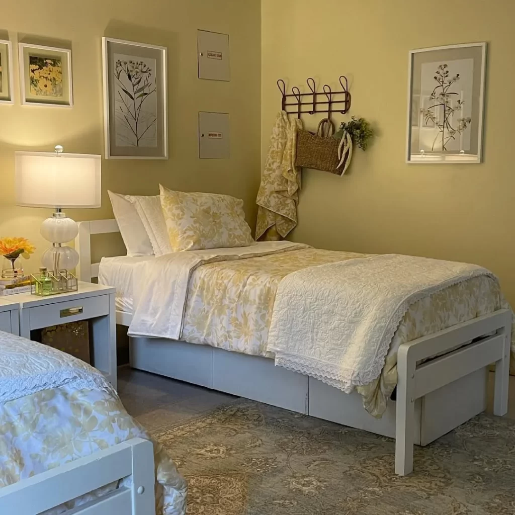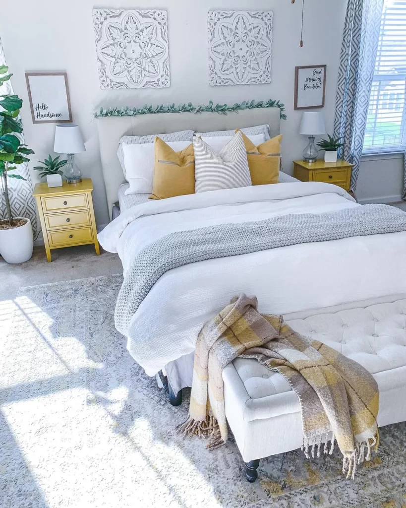Warm sunlight filters through sheer curtains, illuminating a soft white bed layered with textured pillows and a mustard throw. Yellow side tables pop against a calming backdrop, making the space cheerful without overwhelming it. You’ll notice how small elements like leafy garlands and framed quotes give this room a personal, coastal touch. Think beach house energy, but grounded in comfort. If you want a space that feels fresh but lived-in, start with light layers, mix muted whites with golden tones, and bring in greenery. The key here is contrast soft vs. bold, cozy vs. clean.