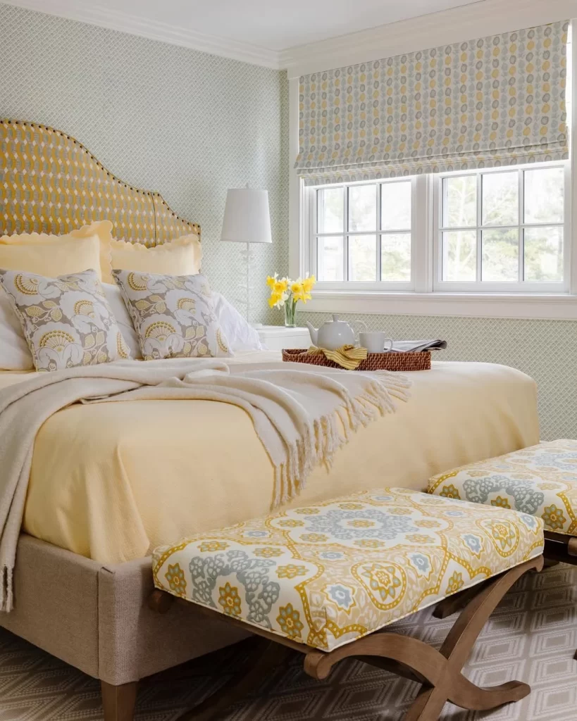 There’s an instant warmth in this bedroom that comes from its subtle mix of color and print. The yellow headboard with scalloped edges adds a vintage feel, while the patterned bench upholstery ties everything together in a playful, coordinated way. You’ll love the way the light pours in from the window, bouncing off the soft cream and pastel yellow bedding. The wallpaper is delicate and textured, offering quiet visual interest without shouting. A woven tray with breakfast essentials makes the space feel lived-in and inviting. Use similar prints, muted pastels, and layers of texture to craft a bright yet serene retreat that feels joyful every morning.