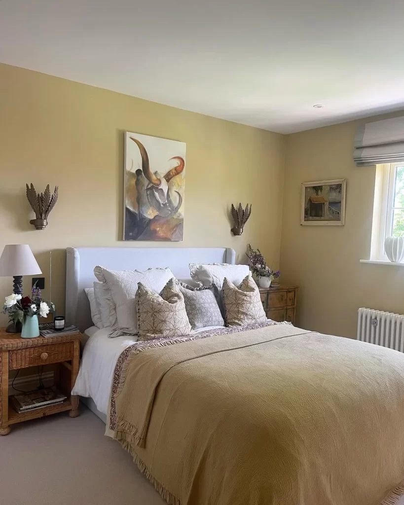 This bedroom whispers calm. From the textured beige bedding to the woven nightstand and sculptural wall sconces, every piece feels intentional and natural. The matte mustard wall sets a cozy backdrop that warms the space without dominating it. You’ll find beauty in the balance floral arrangements add softness while the horn painting above the bed delivers bold character. Light filters through the window quietly, enhancing the organic tones. To achieve this look, opt for a neutral base with warm undertones, vintage-style accessories, and a few handmade elements that feel rooted in nature and nostalgia.