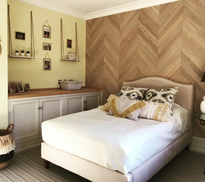 You step into a room that feels handmade and heartwarming. A soft chevron wood wall adds texture, while hanging photo shelves lend a cozy, personal feel. The bed, styled in off-white with mustard-fringed pillows, brings in warmth without clutter. Every element from the low cabinetry to the woven basket speaks to comfort and functionality. Use natural finishes and keep your palette muted to get this look. Think coastal, but grounded in craft and simplicity. It’s the kind of room that says, “Stay a while.”